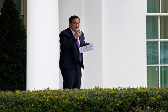 Lindell, giám đốc điều hành công ty MyPillow, đồng minh của Tổng thống Mỹ Donald Trump, cầm tập tài liệu khi đứng bên ngoài cửa ra vào dẫn vào hành lang Cánh Tây, khu văn phòng tổng thống tại Nhà Trắng, trước khi vào gặp Trump vào chiều 15/1.