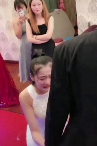 Chú rể tỏ ra khó chịu và có hành động dường như bỏ ngoài tai mọi lời van xin của cô gái, thậm chí quay đi không muốn nhìn mặt cô. Thế nhưng dù tỏ ra rất cương quyết, anh vẫn không thể làm cho cô gái đứng dậy ra về, trái lại cô vẫn tiếp tục khóc lóc van xin.