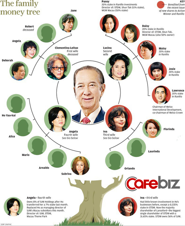 Cuộc đấu đá tranh giành quyền lực để kiểm soát một trong những đế chế casino lớn nhất thế giới đã cho thấy những vết nứt sâu trong gia đình của tỷ phú Stanley Ho. Tuy Stanley có 4 vợ nhưng không rõ ai là người kết hôn hợp pháp với ông.