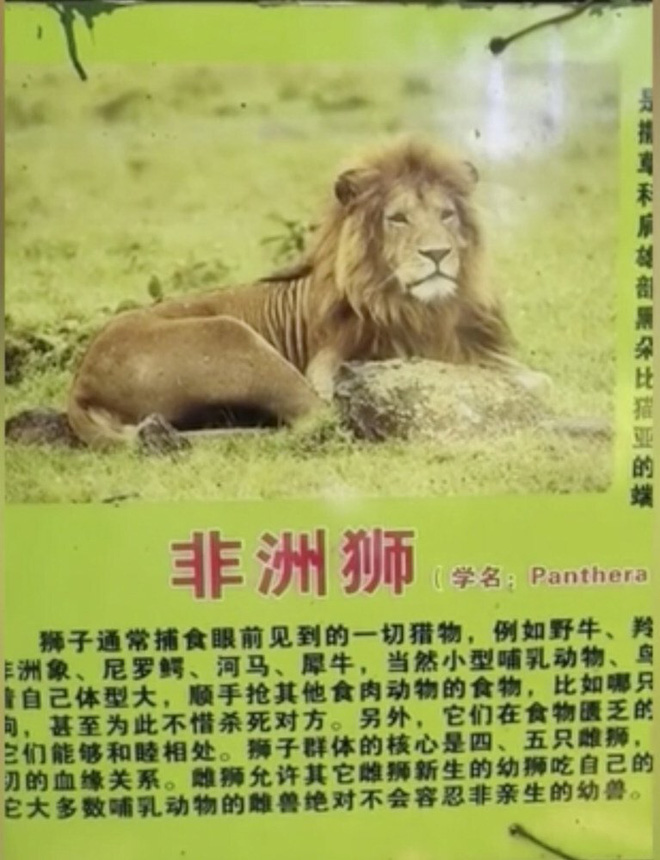 Trong một video clip được lan truyền rộng rãi trên mạng xã hội tuần này, một người đàn ông họ Tang đã đưa con đến thăm vườn thú Yuanjiashan ở Xichang, tỉnh Tứ Xuyên, hôm thứ Bảy tuần trước. Tuy nhiên, ông đã giật mình khi phát hiện một chú chó vàng trong chuồng sư tử châu Phi mặc dù biển báo giới thiệu con vật là một loài thuộc họ mèo.