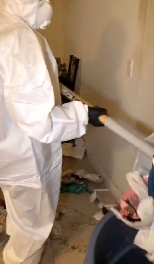 Đoạn video cho thấy một nhân viên dọn dẹp mặc một bộ đồ bảo hộ kín bưng dùng một chiếc xẻng xúc rác rưởi. Nhóm dọn dẹp cho biết đây là một trường hợp tích trữ lớn chưa từng thấy.