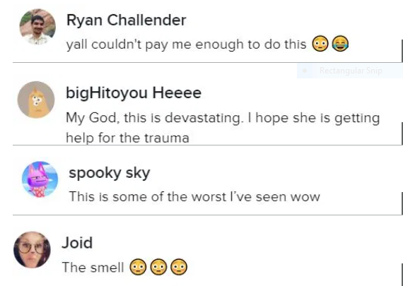Bình luận dưới video, một người nói: "Tôi đã nghỉ công việc dọn dẹp ấy, nó thực sự không phải là công việc của tôi". Người khác bày tỏ thái độ sợ hãi, chỉ cần nhìn thôi đã tưởng tượng ra mùi rất kinh dị rồi.