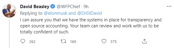 Đáp lại, Musk nói rằng nếu Chương trình lương thực của Thế giới làm kế toán minh bạch và công khai để tất cả mọi người có thể biết số tiền đó được tiêu như thế nào, "có thể miêu tả ngay dưới dòng tweet này cách chính xác để 6 tỷ USD có thể giải quyết được nạn đói, tôi sẽ bán cổ phiếu Tesla ngay lập tức và thực hiện điều đó".
