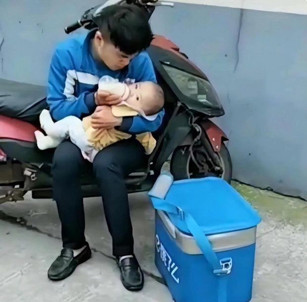Xe điện đậu trước sảnh tòa nhà, bên trong thùng đựng đồ ăn có một bé gái đang ngồi, mỉm cười ngọt ngào trước ống kính. Anh shipper khéo léo pha sữa bột rồi bế trên tay cho em bú bình.
