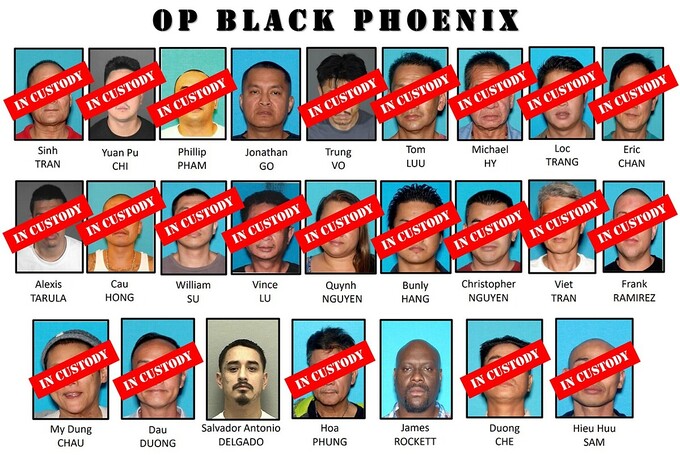 Các vụ bắt giữ vào sáng 15/9 là kết quả của chiến dịch "Phượng hoàng Đen" do Cục Điều tra Liên bang Mỹ (FBI) dẫn đầu, Thom Mrozek, phát ngôn viên Văn phòng Bộ Trưởng Tư pháp Mỹ, cho biết. Tổng cộng có 25 nghi phạm được liệt kê trong 7 bản cáo trạng và có 4 nghi phạm đã bị bắt giam trước đó. Giới chức đang truy tìm những nghi phạm còn lại.