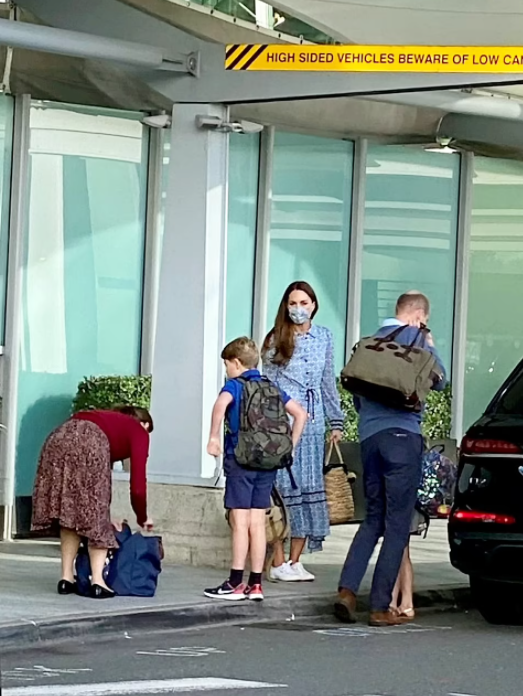 Những bức hình được tờ Daily Mail chia sẻ cho thấy, Hoàng tử William và Công nương Kate bận rộn với các túi đồ, trong khi Hoàng tử George và Công chúa Charlotte đều tự đeo balo của mình. Công nương Kate xinh đẹp dịu dàng trong chiếc đầm Maxi Diamond Geo.