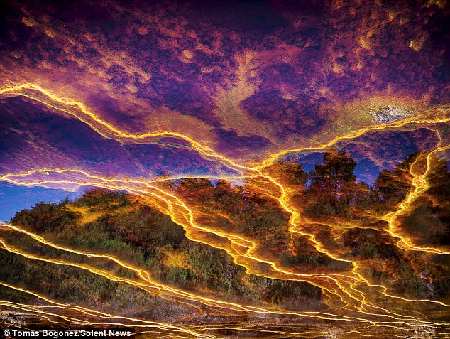 Theo Daliy Mail, những bức ảnh về lòng sông màu đỏ tươi cho thấy những gì dường như là một bầu trời nứt vỡ với những tia sét dữ dội và những đám mây màu cam.