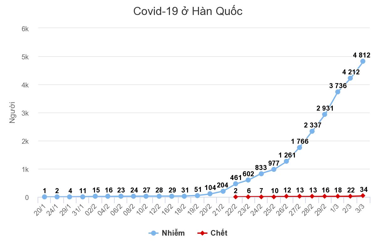 Gần 60% trong hơn 4.800 ca mắc Covid-19 hiện nay ở Hàn Quốc có liên quan tới các tín đồ của Tân Thiên Địa tại thành phố Daegu hoặc những người có liên hệ với họ. Giới chuyên gia dự đoán số ca nhiễm bệnh sẽ tăng cao trong những ngày tới khi giới chức y tế hoàn thành xét nghiệm hơn 210.000 thành viên của giáo phái này.