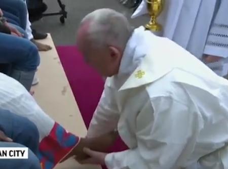 Theo truyền thông phương tây, một số người tị nạn đã khóc khi Giáo hoàng 79 tuổi quỳ trước họ, đổ nước lên chân, lau khô bằng khăn và cúi xuống hôn chân họ.