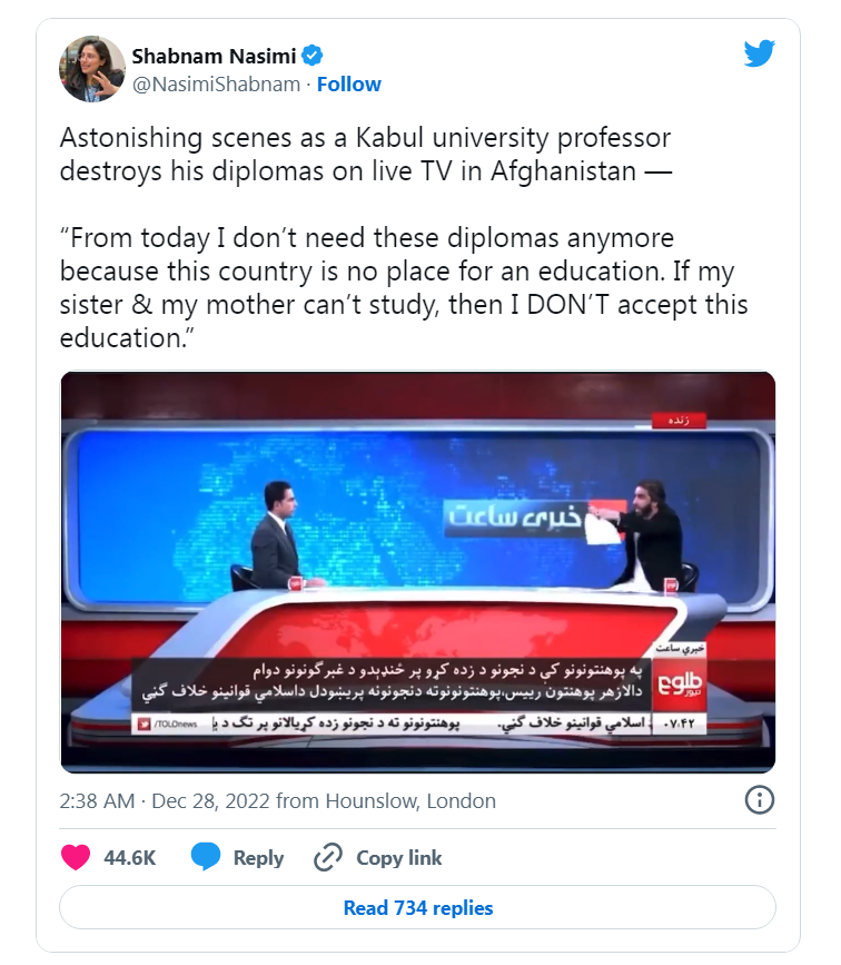 Bà Shabnam Nasimi, cựu cố vấn chính sách cho Bộ trưởng Tái định cư và Bộ trưởng Tị nạn của chính quyền trước đây, đã chia sẻ đoạn video trên Twitter và viết: “Cảnh tượng đáng kinh ngạc khi một giáo sư đại học ở Kabul xé bỏ bằng tốt nghiệp của mình trên truyền hình trực tiếp ở Afghanistan”.