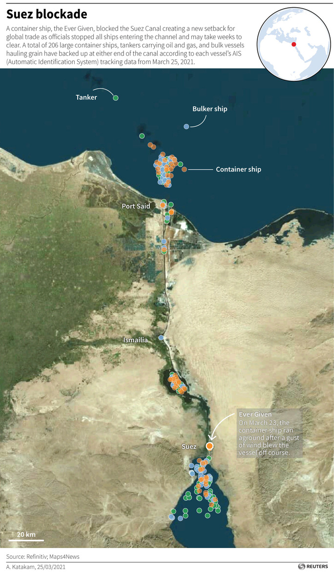 Tàu container Ever Given dài 400 m, cao gần bằng với tòa nhà Empire State, đang chặn quá trình vận chuyển cả hai chiều tại kênh dào Suez. Đây là con kênh bận rộn nhất thế giới, nối liền châu Á và châu Âu, nơi vận chuyển dầu, nhiên liệu tinh chế, ngũ cốc và các mặt hàng thương mại khác.