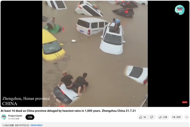 Theo báo The Paper, vào ngày 21-7-2021, kênh Project Earth trên nền tảng video YouTube đã phát hành một đoạn video có thời lượng là 4 phút 28 giây, trong đó bao gồm các clip từ 32 giây đến 1 phút 01 giây. Video gốc có chú thích "Vào ngày 21-7-2021, Trịnh Châu đã hứng chịu trận mưa ngàn năm mới có một lần". Kênh Project Earth cho biết các clip lấy đến từ các nền tảng xã hội lớn và được biên tập theo ngày, địa điểm.