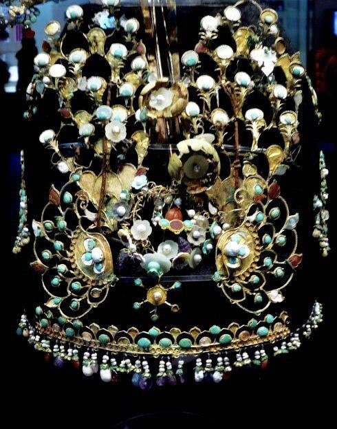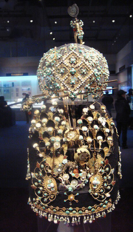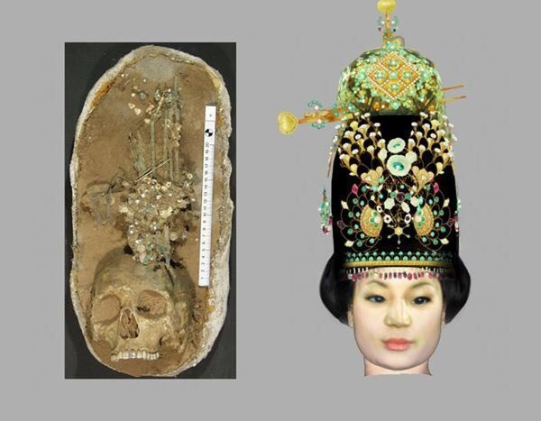 Các đồ trang trí trên chiếc mũ độc đáo này bao gồm một số lượng lớn các vật liệu siêu nhỏ khác nhau, trong đó viên ngọc trai nhỏ nhất chỉ có đường kính khoảng 2mm. Lúc đó, các nhà khảo cổ đều nhận định rằng việc di dời chiếc mũ ra khỏi mộ sẽ gây khó khan lớn cho việc phục hồi hình dạng chiếc mũ . Bởi vậy sau đó họ đã lựa chọn phương pháp lấy ra bằng cách chiết túi thạch cao.