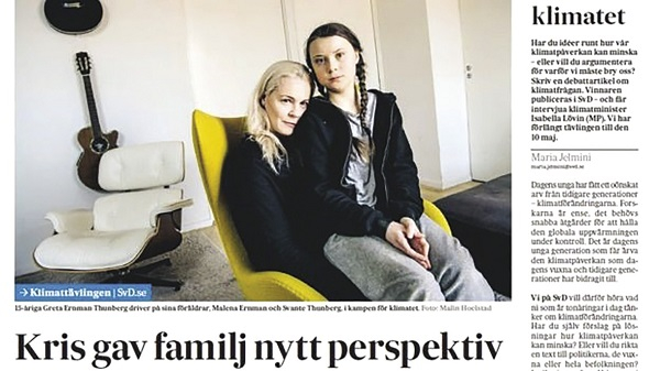 Sau đó, cô đăng bức hình đang ngồi bên ngoài quốc hội Thụy Điển để phản đối việc chính phủ không có những hành động quyết đoán hơn đối với biến đổi khí hậu. Cô chú thích: “Trẻ em chúng tôi thường không làm những gì người trưởng thành bảo chúng tôi làm. Mà chúng tôi làm y như quý vị làm. Và vì quý vị không quan tâm về tương lai của tôi, tôi cũng chẳng thèm quan tâm luôn!”.