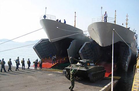 Xe tăng PT-76 di chuyển vào trong tàu đổ bộ tự đóng của Việt Nam để chuẩn bị cho diễn tập. |