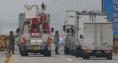 | Binh sỹ Hàn Quốc kiểm tra các xe chở hàng tại lối vào khu công nghiệp Keasong ngày 21/8. (Nguồn: Yonhap/TTXVN) |