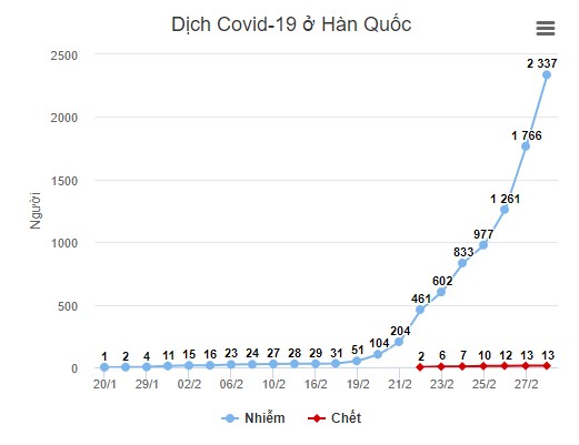 Đây là mức tăng mạnh nhất tại Hàn Quốc trong một ngày từ khi dịch Covid-19 bùng phát ở nước này, vượt mức tăng 327 ca nhiễm mới tại Trung Quốc hôm nay. Mới hai ngày trước, số người nhiễm nCoV tại Hàn Quốc chỉ hơn 1.000.