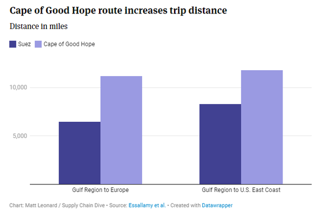 Giám đốc Matt Smith của Clipper Data cho biết phần lớn tàu chở dầu xuất khẩu của Mỹ đã chuyển hướng tránh khỏi kênh đào Suez, chuyển đến đỗ ở Châu Âu hay vòng qua Châu Phi nhằm đưa hàng đến Châu Á.