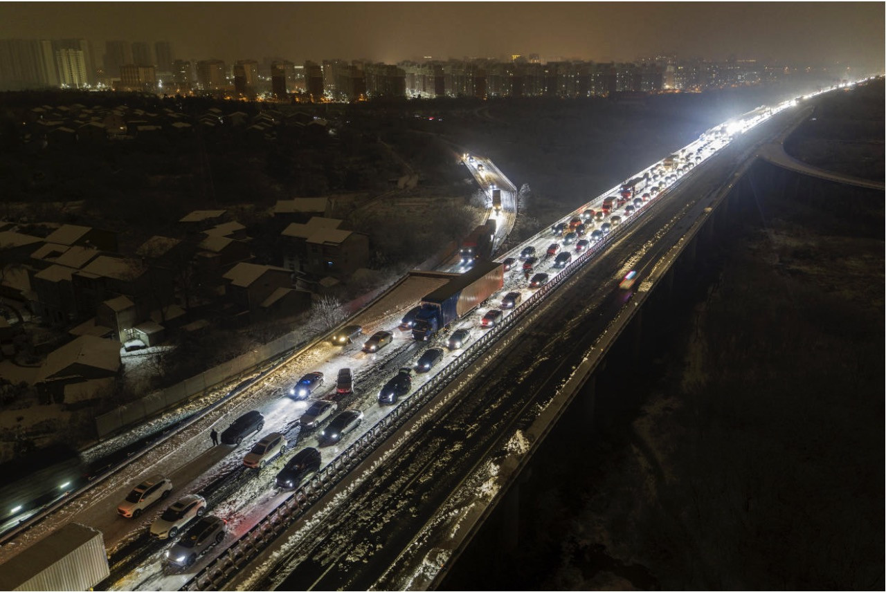 Một quan chức tỉnh Hồ Bắc cho biết, khoảng 4.000 ô tô bị mắc kẹt do thời tiết băng giá. Hình ảnh chụp từ trên không vào tối qua cho thấy, hàng dài xe ô tô không thể nhúc nhích, tình trạng tắc nghẽn này được kỳ vọng sẽ chấm dứt trong ngày hôm nay.
