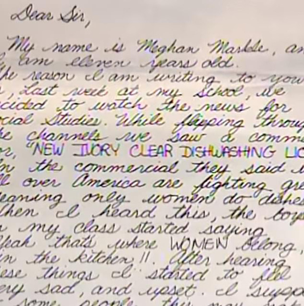 28 năm trước, ở tuổi 11, Meghan Markle đã viết thư kiện cho Procter & Gamble để phản đối tính chất phân biệt giới tính trong một quảng cáo xà phòng rửa bát của hãng có nội dung: "Các bà mẹ trên khắp nước Mỹ đang vật lộn với những chiếc xoong và chảo đầy dầu mỡ". Cô gái nhỏ hồi đó cũng không hề nghĩ rằng bức thư của mình lại được biết đến rộng rãi, tạo nên sức ảnh hưởng vô cùng lớn, khiến nhãn hàng này sau đó phải đổi nội dung từ "Các bà mẹ khắp nước Mỹ" thành "Mọi người dân khắp nước Mỹ".