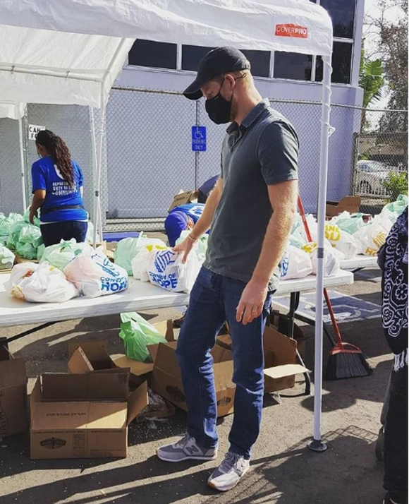 Trong ảnh, hoàng tử 36 tuổi đã cùng các tình nguyện viên đóng gói và phân phát kiện thực phẩm cho cựu chiến binh và thân nhân cùng những người dân khó khăn ở Compton, California. Sự kiện diễn ra chỉ cách nơi Meghan lớn lên khoảng 20 phút lái xe.