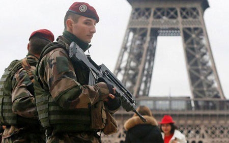 Binh sỹ Pháp trên đường phố Paris sau vụ tấn công khủng bố 13/11. |