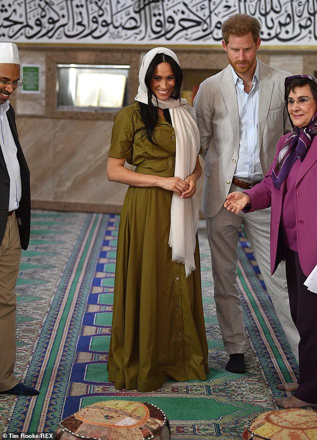 Nữ công tước xứ Sussex gây chú ý với chiếc váy dài màu rêu, quàng khăn trùm đầu màu kem. Đây là lần đầu tiên cô được nhìn thấy sử dụng khăn trùm đầu trước công chúng nhưng bị chê trách là thiếu tinh tế khi trùm khăn không đúng với quy tắc truyền thống.