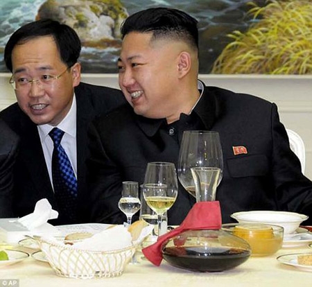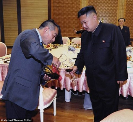 Đầu bếp Fujimoto rót rượu cho ông Kim Jong-un khi đôi bên gặp mặt hồi năm 2012 (Ảnh: Daily Mail) |
