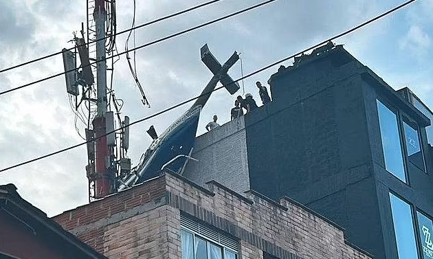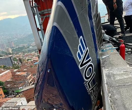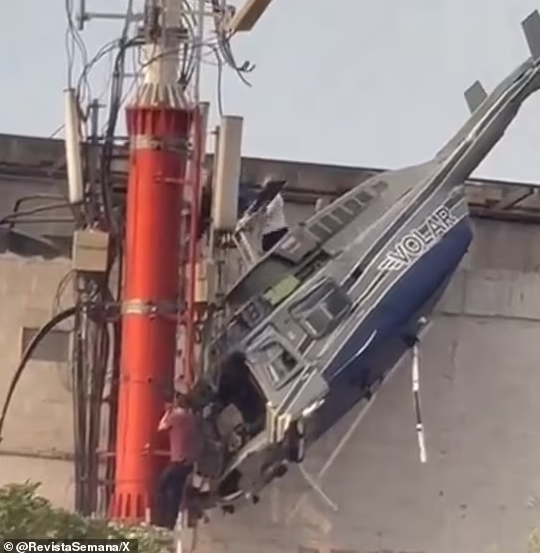 Trực thăng đâm vào một bên của tòa nhà cao tầng ở Medellin và treo lơ lửng nhưng may mắn, tất cả 6 người trên máy bay đều sống sót một cách kỳ diệu.