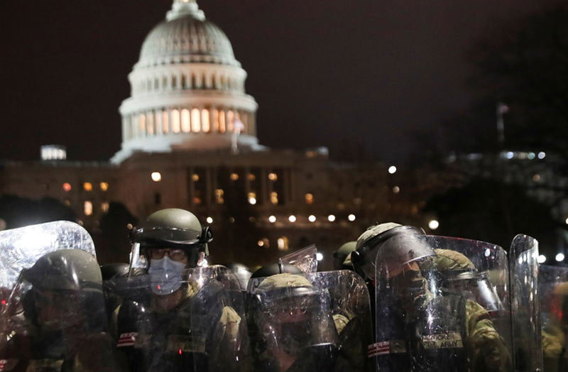 An ninh được tăng cường cao độ trong lúc các nhà lập pháp Mỹ tập hợp trở lại Đồi Capitol để xác nhận phiếu Cử tri đoàn cho cuộc bầu cử tổng thống Mỹ 2020, vài giờ sau khi một nhóm đông biểu tình xông vào tòa nhà khiến các quan chức phải sơ tán.