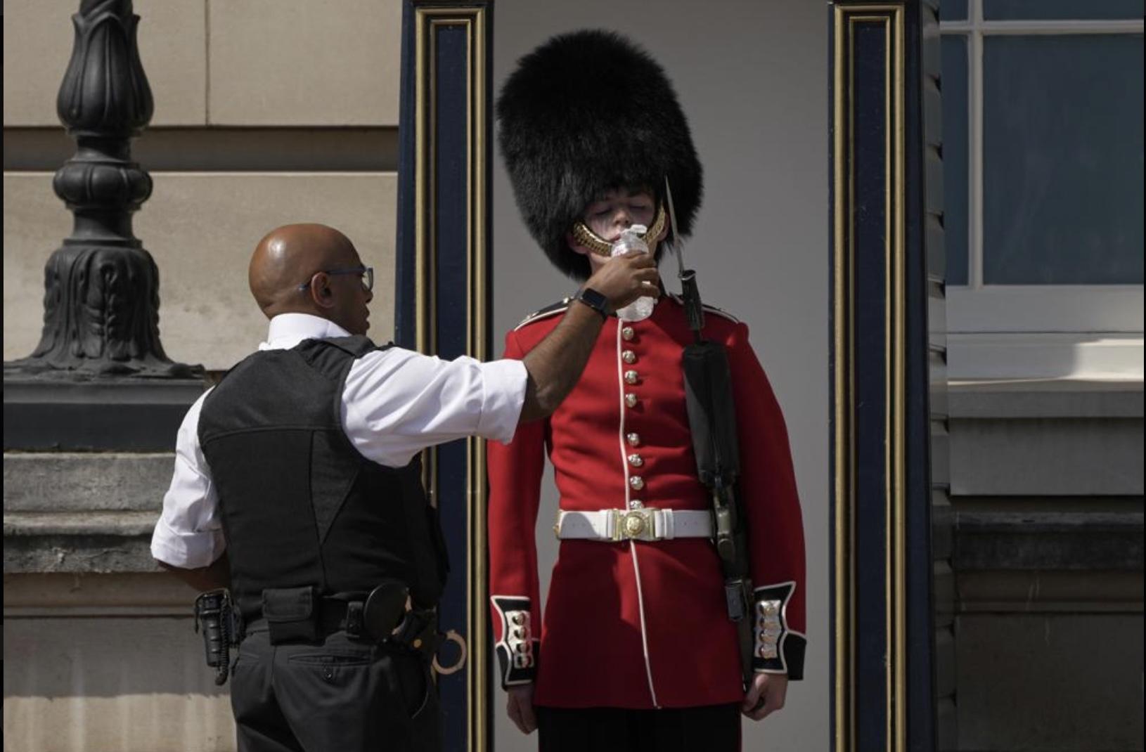 Lính canh tại Cung điện Buckingham đã phá vỡ chủ nghĩa chấp nhận nghịch cảnh như thường lệ của họ để uống từng ngụm nước. Lần đầu tiên trong lịch sử, nhiệt độ ở Anh tăng kỷ lục, lên trên 40 độ C.