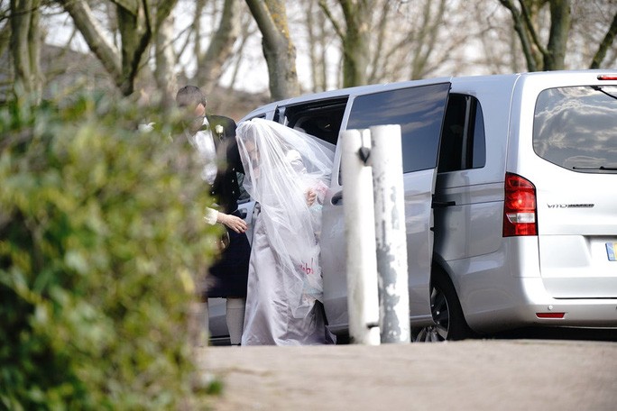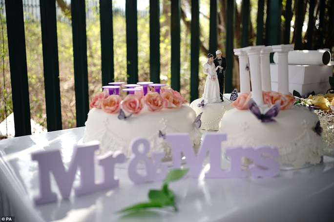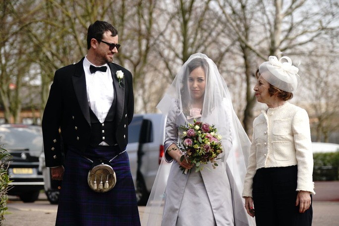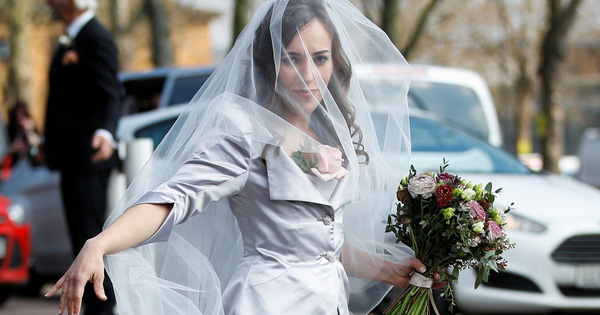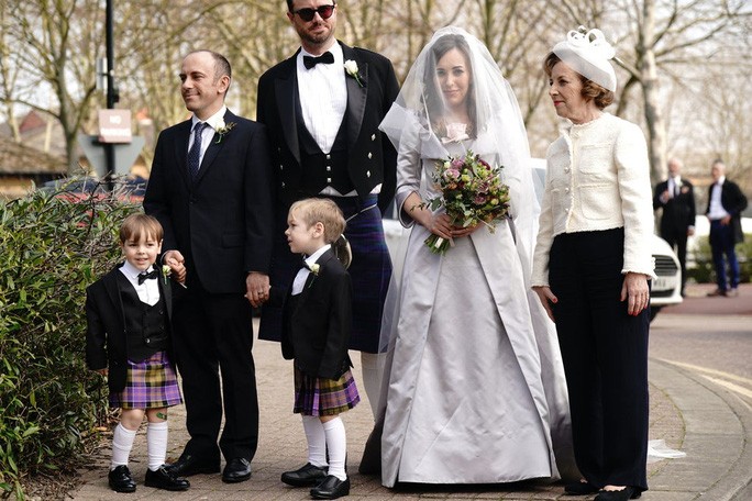 Bà Moris trông rạng rỡ với chiếc váy cô dâu màu trắng, có mạng che mặt, chụp ảnh bên ngoài nhà tù. Chiếc váy này - cùng với bộ đồ mà chú rể mặc trong ngày cưới - là sản phẩm của nhà thiết kế Dame Vivienne Westwood.