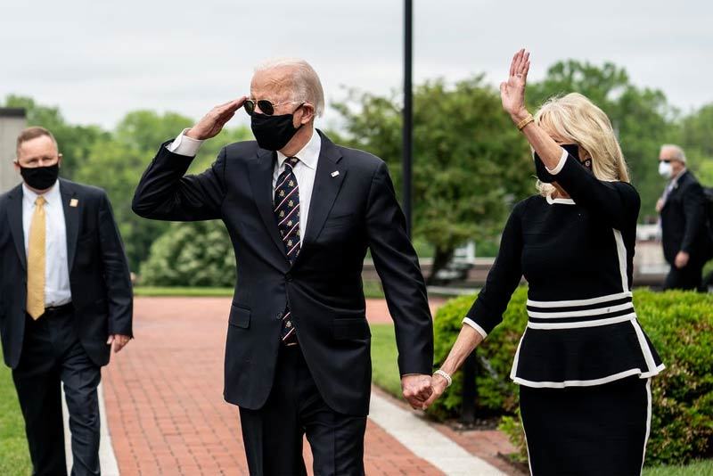 Theo NY Times, ứng viên tổng thống đảng Dân chủ này cùng vợ, Jill Biden, cùng đeo khẩu trang đen khi đến đặt vòng hoa tại đài tưởng niệm những người lính Thế chiến 2 và Chiến tranh Triều Tiên ở Delaware, hôm 25/5.