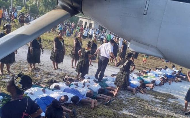 Cụ thể, trong tấm hình nói trên, người đàn ông mặc áo sơ mi trắng được cho là Đại sứ Trung Quốc Tang Songgen đã không đi trên tấm thảm đỏ thường thấy ở những lễ tiếp đón thông thường - mà thay vào đó, ông đã bước đi trên... lưng của khoảng 30 người đàn ông đang nằm sấp trên mặt đất, với sự trợ giúp của hai người phụ nữ mặc trang phục truyền thống Kiribati.