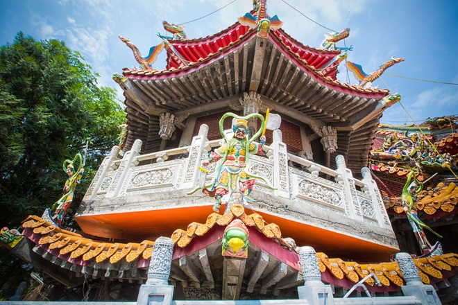 Ngôi đền Vũ Xương ban đầu được xây dựng vào năm 1923 và thờ Trấn Vũ một vị thần tượng trưng cho sao Bắc cực, thống trị phương Bắc, quản lý các loài thủy tộc trong tín ngưỡng Đạo giáo. Đến năm 1990, một người dân địa phương đã tặng mảnh đất rộng 471 mét vuông cho ngôi đền và bắt đầu khởi công xây dựng vào một năm sau. Mất 8 năm, ngôi đền mới được hoàn thành nhưng chỉ một năm sau - tức năm 1999, đền Vũ Xương đã bị trận động đất phá huỷ.