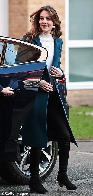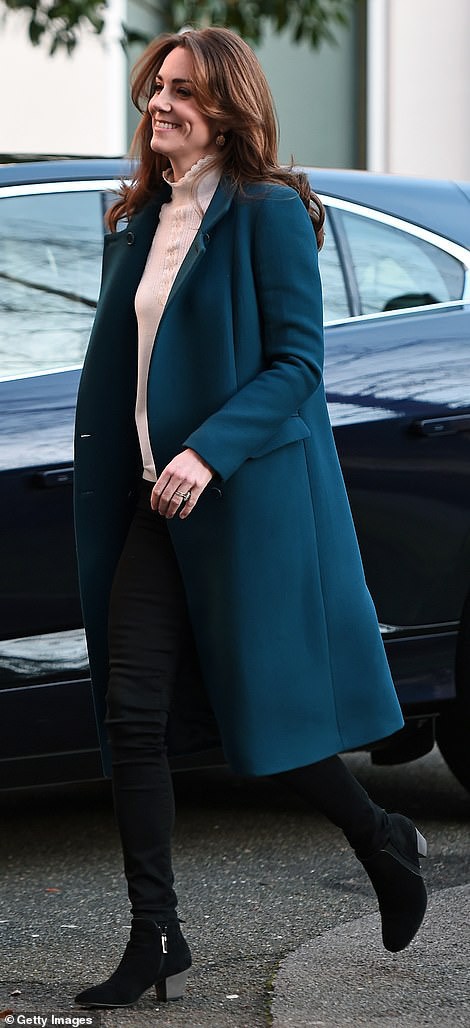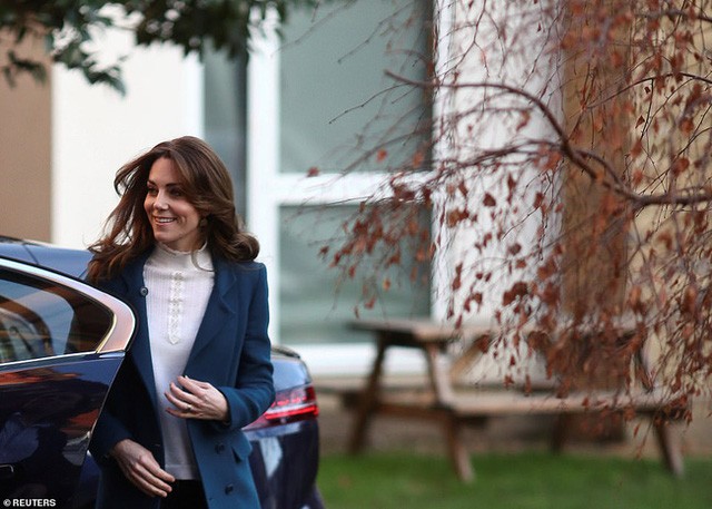 Ở sự kiện này, cô gây bất ngờ với vẻ ngoài trẻ trung và năng động. Công nương Kate mặc quần jean skinny đen và áo len màu kem kết hợp với áo khoác ngoài màu xanh. Mái tóc mới bồng bềnh của nàng dâu hoàng gia khiến cô thêm tươi trẻ, căng tràn sức sống.