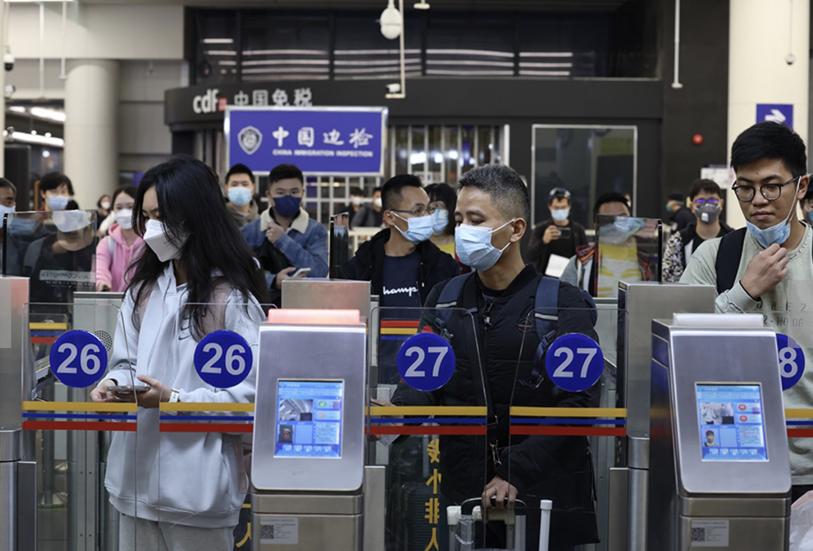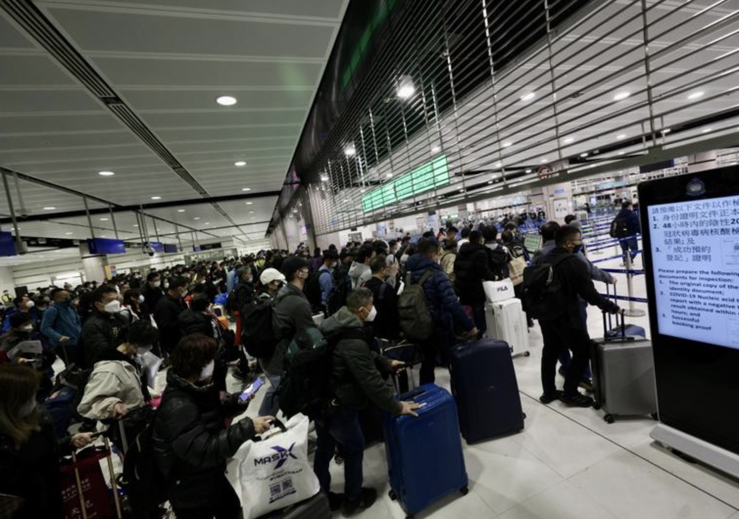 Những hành khách đầu tiên từ Trung Quốc đại lục đi tới đặc khu hành chính Hong Kong tại cảng Futian, Thâm Quyến ngày 8/1/2023.