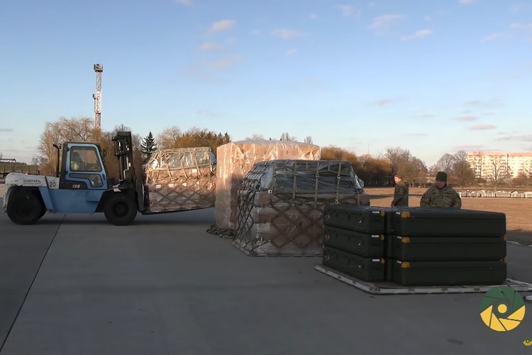 Video được kênh Ukrainian Military TV đăng tải cho thấy, các xe bốc xếp đang chuyển những kiện hàng chứa tên lửa phòng không Stinger từ khoang chứa của máy bay vận tải quân sự Boeing C-17 xuống đường băng sân bay.