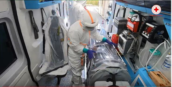 Đáng chú ý là hình ảnh, do xe bị xóc nên khiến người bệnh khó chịu và rên rỉ liên tục. Nhận thấy điều này, một nhân viên y tế ngồi bên cạnh vừa dùng tay giữ cáng - được thiết kế dành riêng cho bệnh nhân Covid-19, vừa xoa tay lên lớp bảo hộ an ủi bệnh nhân.