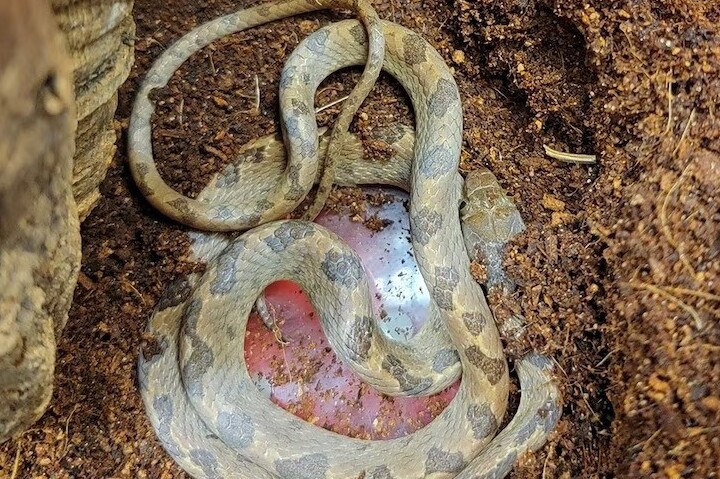 Nhân viên bảo tồn động vật được điều động tới cửa hàng thực phẩm và phát hiện con rắn mắt mèo có hoa văn dài khoảng 45cm. Con vật sau đó được bàn giao cho Rainforest Reptile Shows, một công ty giáo dục tổ chức các chương trình tương tác và bảo vệ động vật bò sát.