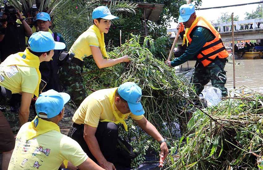 Trong trang phục áo phông vàng, mặc quần rằn ri và đội mũ lưỡi trai, Hoàng quý phi Thái Lan gây bất ngờ với vẻ ngoài năng động và trẻ trung. Bà cùng với đội tình nguyện tham gia hoạt động làm vệ sinh môi trường.