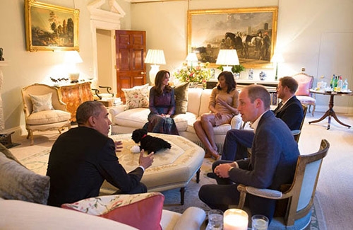 Vợ chồng ông Obama và vợ chồng William - Kate, hoàng tử Harry cùng trò chuyện sau bữa ăn tối. |