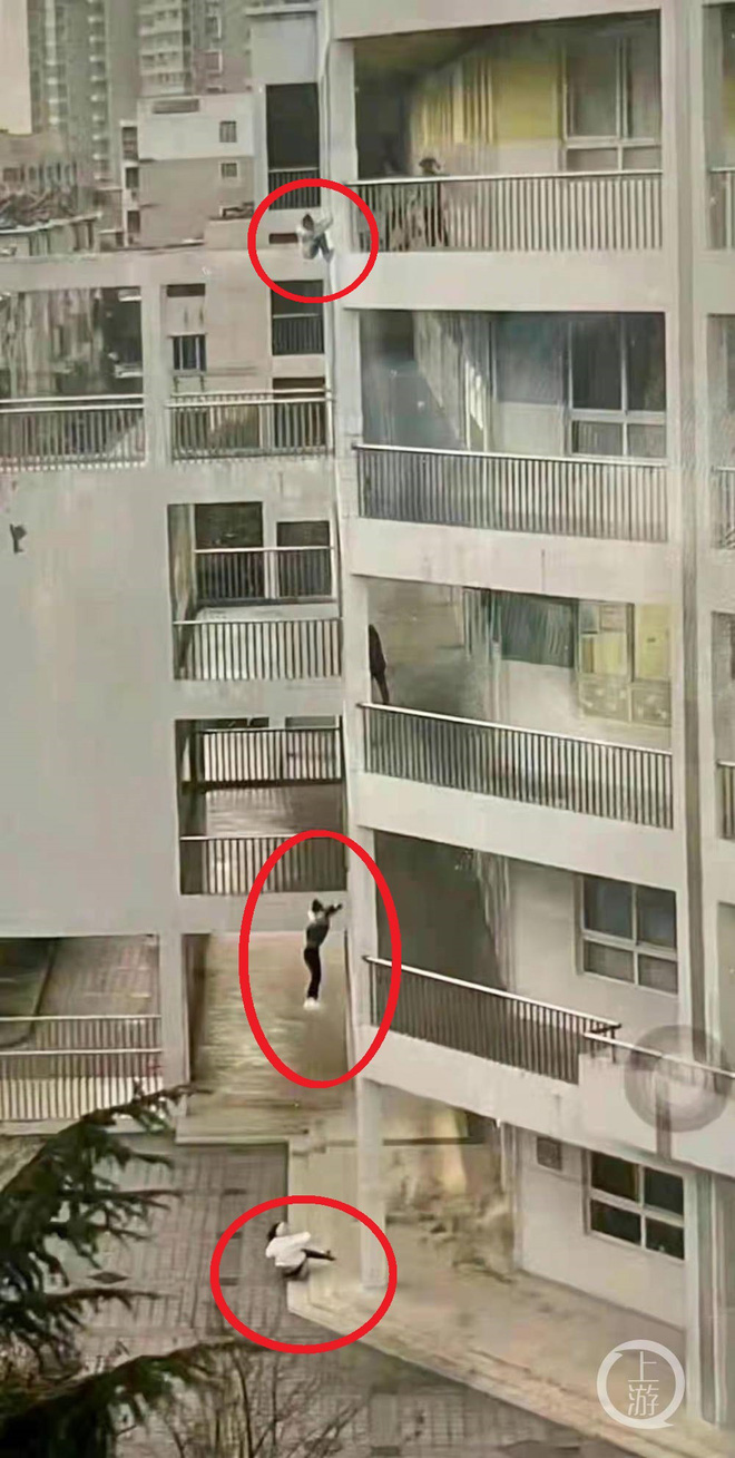 Theo hình ảnh được ghi lại lan truyền trên mạng xã hội, 3 em đã lần lượt nhảy xuống gần như cùng lúc. Trên hành lang nơi các em nhảy xuống còn có 2 người bạn nữa đứng nhìn nhưng không ngăn cản.