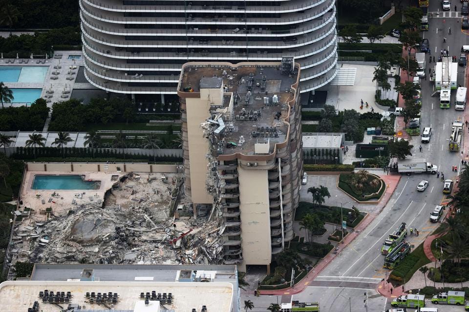 Một phần tòa nhà phức hợp dân cư Champlain Towers South tại thị trấn Surfside, cách thành phố Miami Beach khoảng vài km về phía Bắc đổ sập vào lúc 1 giờ 30 sáng 24/06 (giờ địa phương), để lại đống đổ nát khổng lồ.