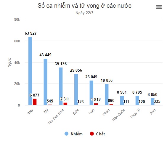Italy, vùng dịch lớn nhất châu Âu và lớn thứ hai thế giới, ghi nhận 63.927 ca nhiễm và 6.077 người chết, tăng lần lượt 4.789 và 601 ca. Tỷ lệ tử vong ở nước này khoảng 9,5%, cao gấp đôi trung bình toàn cầu. Dân số già và bệnh viện quá tải là hai trong số các nguyên nhân khiến tỷ lệ tử vong ở Italy đặc biệt cao.
