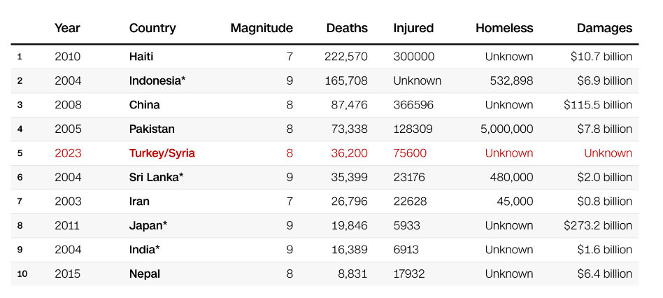 Tính gộp thêm gần 5.000 ca tử vong ở Syria, tổng số trường hợp thiệt mạng vì động đất ở 2 nước láng giềng đã lên tới 36.200 người, theo CNN. Ước tính khoảng 75.600 người khác bị thương, khiến thảm họa động đất này được đánh giá là thiên tai gây thương vong lớn thứ 5 trên toàn thế giới trong 20 năm qua.