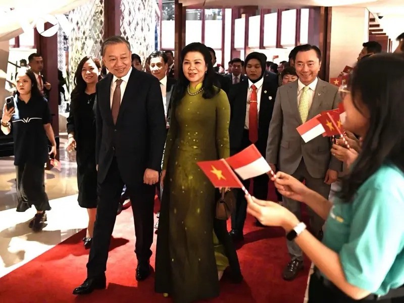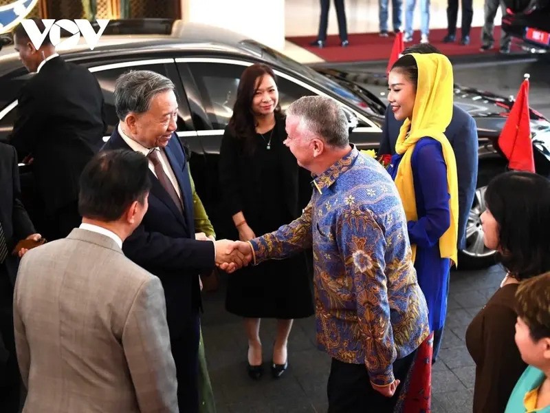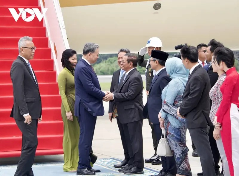 Tại sân bay quân sự Halim Pedranakusuma với sự coi trọng cao độ, trọng thị, cởi mở và thắm tình hữu nghị, Indonesia đã bắn 7 loạt đại bác chào mừng đoàn đại biểu cấp cao nước ta. Đón Tổng Bí thư Tô Lâm và Phu nhân có Bộ trưởng Bộ Hàng hải và Thuỷ sản Indonesia Sakti Wahyu Trenggono, Đại sứ Indonesia tại Việt Nam, Đại sứ Việt Nam tại Indonesia Tạ Văn Thông, Đại sứ, Trưởng Phái đoàn Việt Nam tại ASEAN Tôn Thị Ngọc Hương cùng đại diện cán bộ, nhân viên Đại sứ quán và Phái đoàn Việt Nam tại ASEAN.