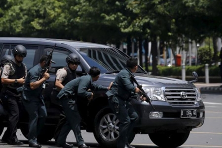 Cảnh sát Indonesia vào vị trí sau vụ nổ làm chấn động Jakarta hôm 14/1. Ảnh: Reuters |