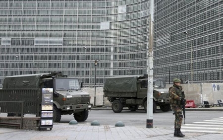 | Một binh sĩ Bỉ đứng canh gần xe quân sự bên ngoài trụ sở Ủy ban châu Âu (EC) tại Brussels. Ảnh: Reuters |