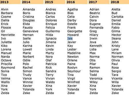 WMO hiện có 2 bộ tên gọi của cả nam giới và phụ nữ đủ dùng để đặt tên cho các cơn bão nhiệt đới trong 6 năm, một bộ dành cho các cơn bão ở Đại Tây Dương và một bộ cho những cơn thịnh nộ của Mẹ Thiên nhiên tại Đông Bắc Thái Bình Dương.